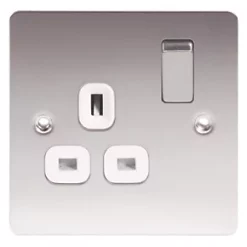 Single switched socket with colour-coded terminals and backed out captive screws for ease of installation. Fits 35mm back box, making it suitable for retro-fit replacement of existing sockets. Features low profile, screwless flat plate that clips on and off, ideal for modern interiors.
