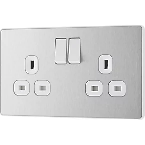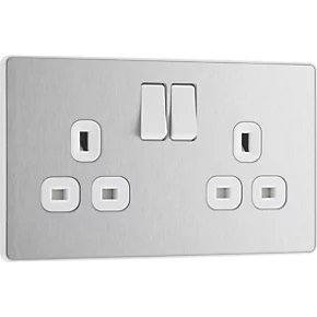 British General Evolve 13A 2-Gang SP Switched Socket Brushed Steel with White Inserts