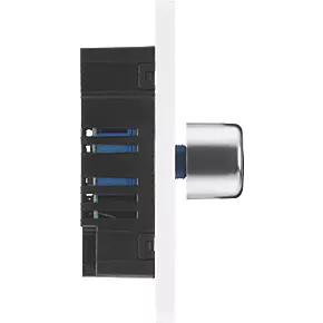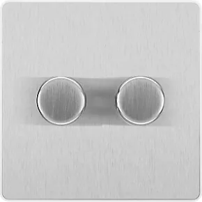 Evolve, trailing edge, double dimmer switch that controls light levels and sets mood. Intelligent electronic circuit monitors connected load and provides a soft-start with protection against thermal, current and voltage overload. Suitable for dimming LED, dimmable CFLs and traditional lighting. Soft-start brings the lights to a set level in around 1 second and extends lamp life. Silent operation means no noise when dimming, while support for low wattage lamps eliminates flicker. Low profile screwless flat plate that clips on and off. Ideal for modern interiors.