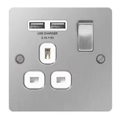 Be the first to review “British General Nexus Metal 13A 2-Gang SP Switched Socket + 3.1A 2-Outlet Type A USB Charger Brushed Steel with Graphite Inserts” Cancel reply