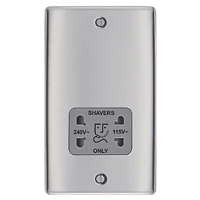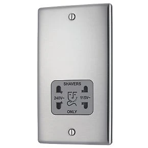 British General Nexus Metal 2-Gang Dual Voltage Shaver Socket 115 / 240V Brushed Stainless Steel with Graphite Inserts