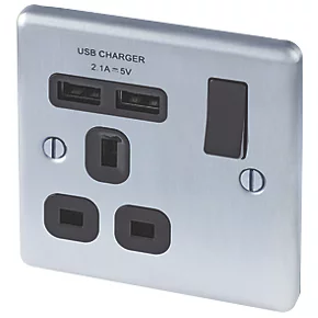 Decorative switched socket with 2 x USB charging ports. Features angled in-line terminals and includes backed out captive screws for easy installation. Ideal for charging iPads, iPhones, tablets, mobiles, cameras and more.