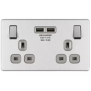 LAP 13A 2-Gang DP Switched Socket + 3.1A 2-Outlet Type A USB Charger Brushed Stainless Steel with Graphite Inserts