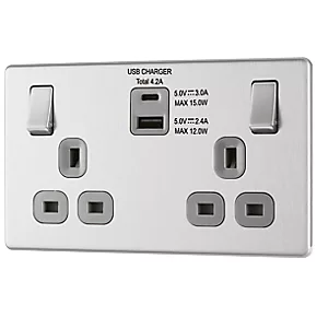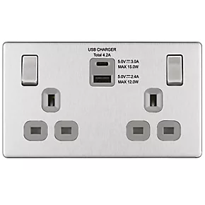 Easy to install, switched socket with USB charger. Removable, decorative screwless flat-plate and slim, clip-on profile. Supplied with 10mm spacer for fitting into a 25mm box. Ideal for redecoration projects.