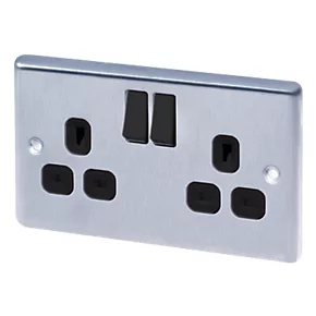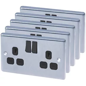 LAP 13A 2-Gang SP Switched Plug Socket Brushed Stainless Steel with Black Inserts 5 Pack