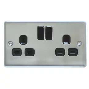 LAP 13A 2-Gang SP Switched Plug Socket Brushed Stainless Steel with Black Inserts