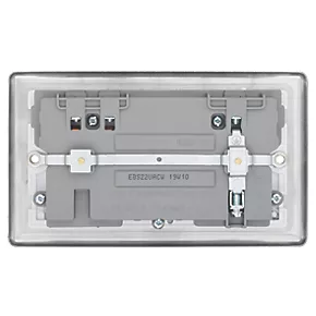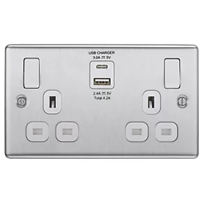 Decorative metal socket with USB charging, 2 x USB ports, 4.2A total. Ideal for charging iPads, iPhones, tablets, mobiles, cameras, MP3s and more. Features angled, in-line terminals and includes backed out captive screws for easy installation. Quick and easy to install. Fits in a 25mm wall box. Supplied with a 10mm spacer.