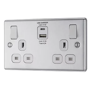 LAP 13A 2-Gang SP Switched Socket + 4.2A 2-Outlet Type A & C USB Charger Brushed Stainless Steel with White Inserts