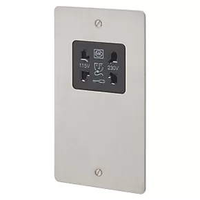 MK Edge 2-Gang Dual Voltage Shaver Socket 115 / 230V Brushed Stainless Steel with Black Inserts