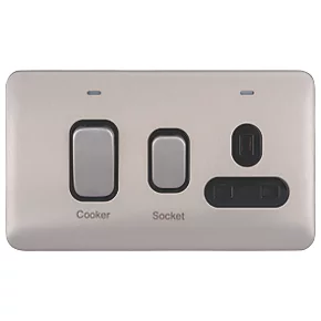 Be the first to review “Schneider Electric Lisse Deco 45A 2-Gang DP Cooker Switch & 13A DP Switched Socket Brushed Stainless Steel with LED with Black Inserts” Cancel reply